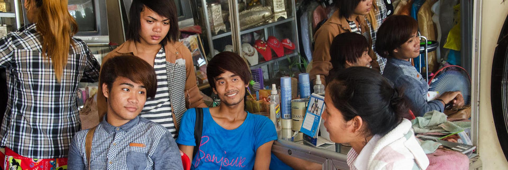 An outreach worker discusses health issues with young people in Cambodia.