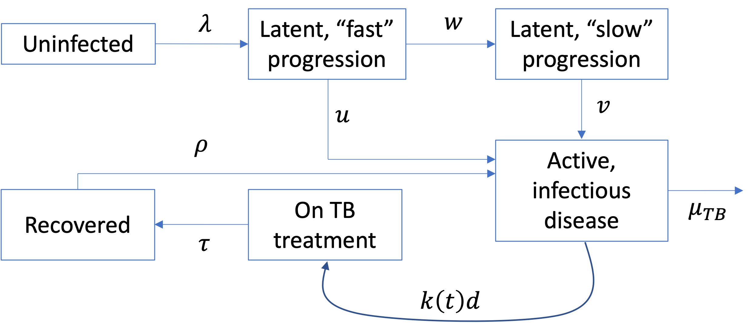 | Per-capita rate of self-cure in the absence of treatment | 0.67 (0.50, 0.84) | (4), parameters determined so that untreated TB case has an average duration of 3 years with CFR of 50% |